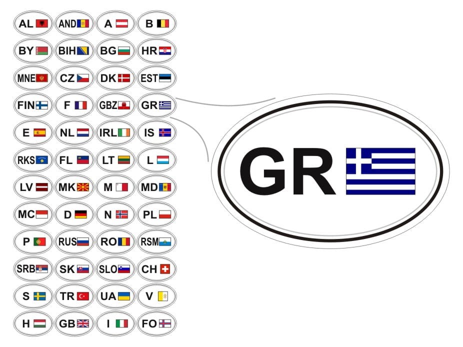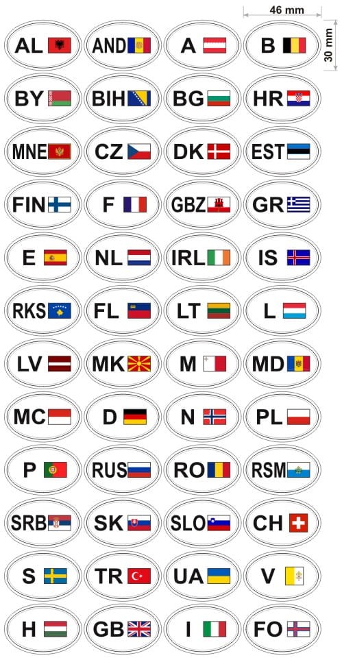 Komplet Europa zawiera : Albania – (AL) ; Andora – (AND) ; Austria – (A) ; Belgia – (B) ; Białoruś – (BY) ; Bośnia i Hercegowina – (BIH) ; Bułgaria – (BG) ; Chorwacja – HR) ; Czarnogóra – (MNE) ; Czechy – (CZ) ; Dania – (DK) ; Estonia – (EST) ; Finlandia – (FIN) ; Francja – (F) ; Gibraltar - (GBZ) ; Grecja – (GR) ; Hiszpania – (E) ; Holandia – (NL) ; Irlandia – (IRL) ; Islandia – (IS) ; Kosowo - (RKS) ; Liechtenstein – (FL) ; Litwa – (LT) ; Luksemburg – (L) ; Łotwa – (LV) ; Macedonia – (MK) ; Malta – (M) ; Mołdawia – (MD) ; Monako – (MC) ; Niemcy – (D) ; Norwegia – (N) ; Polska – (PL) ; Portugalia – (P) ; Rosja - (RUS) ; Rumunia – (RO) ; San Marino – (RSM) ; Serbia – (SRB) ; Słowacja – (SK) ; Słowenia – (SLO) ; Szwajcaria – (CH) ; Szwecja – (S) ; Turcja – (TR) ; Ukraina – (UA) ; Watykan – (V) ; Węgry – (H) ; Wielka Brytania – (GB) ; Włochy - (I) ; Wyspy Owcze - (FO) ...